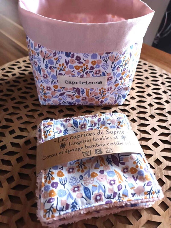 - Panière + lot de 6 lingettes Foret enchantée, Fun pop, Fée corasie, Eventails japonais rose, Eventails japonais moutarde, Eventails japonais noir et Fleurette mauve .