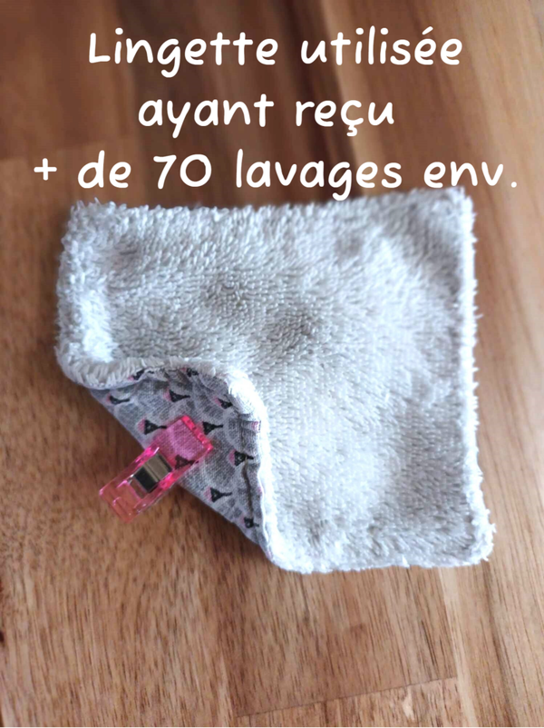 La lingette et le mini gant lavables ont une durée de vie très longues comme démontre une des photos, privilégier le lavable à 30° avec un filet .